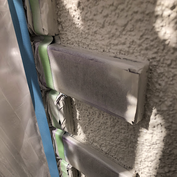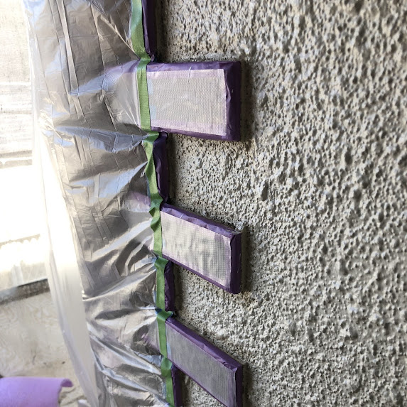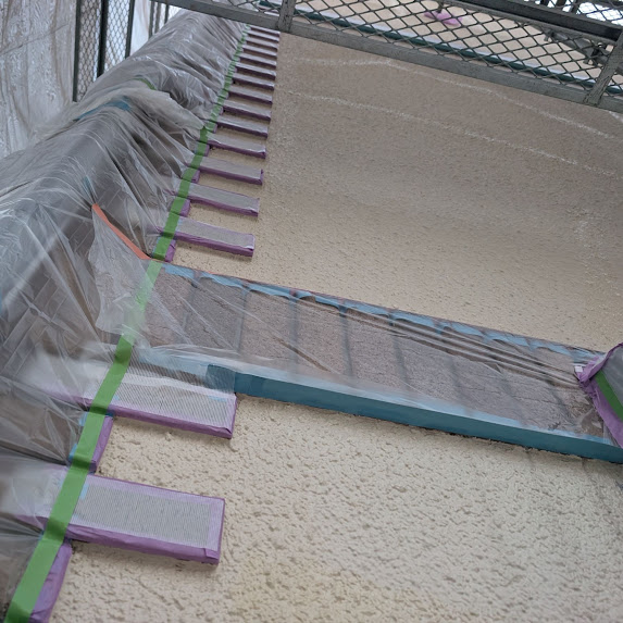 レンガタイルの養生と吹き付けライン出しを行いました🤩