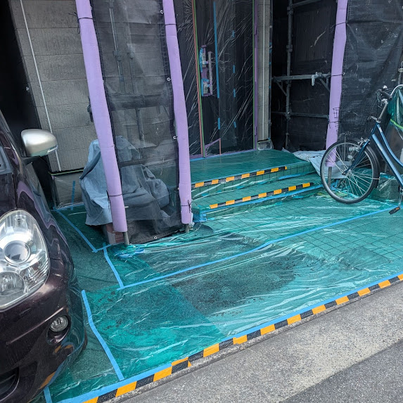 玄関まわりや通路、ベランダの床にはビニールシートを敷き、