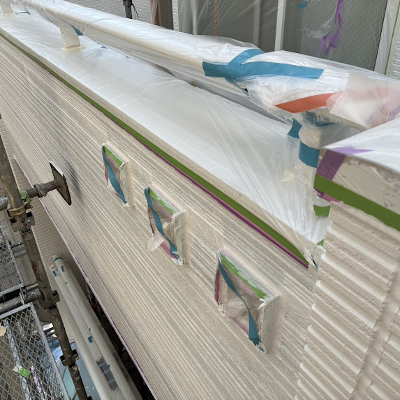 今回の写真は、既存の外壁デザインを活かしながら施工できるクリヤー塗装「ファインDF」を使用した様子です。