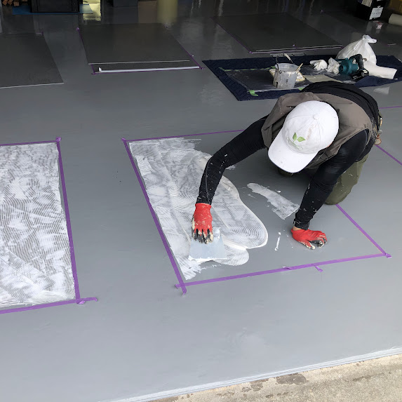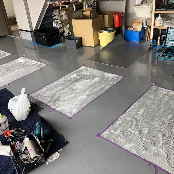 土間の塗装が終わったあとで車のタイヤが乗る箇所に施工しました。