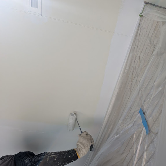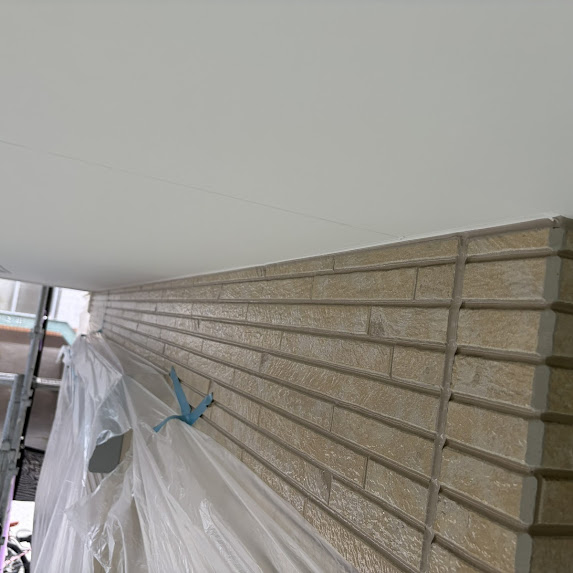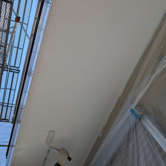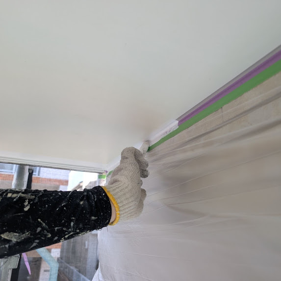 外壁がクリヤー塗装を施工しているため飛散しそうな箇所は全てビニール養生をしてから塗ります。