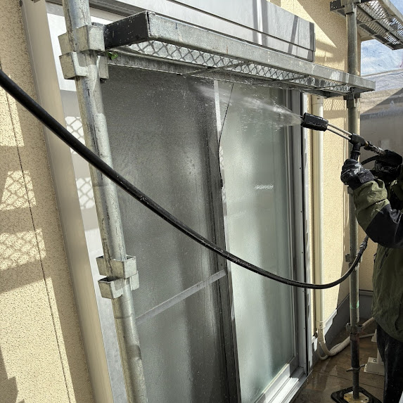 外壁塗装前の下準備として、高圧洗浄を行いました。